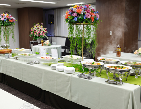 お料理の設営はもちろん、取皿・お箸・ゴミ袋などの備品もご用意。前準備から片付け・回収まで、すべて当社スタッフが対応いたします。飲み放題プランもご用意しておりますので、幹事様も安心してお任せいただけます。